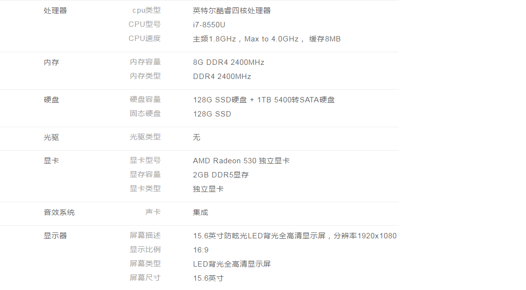 15.6英寸FHD/i7-8550U/8G/128G+1TB(5400转)/2G独显/win10 h/三年保