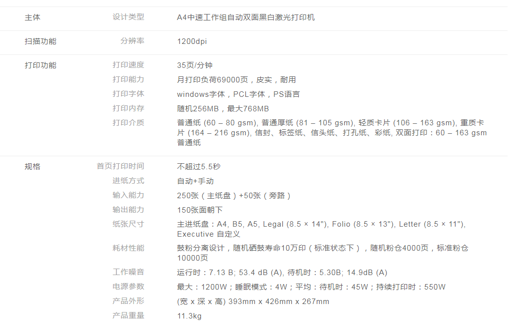 A4中速黑白激光打印机,自动双面打印,速度高达35页/分钟,月打印负荷69000页,皮实,耐用,使用寿命长,随机硒鼓容量10万页,随机粉仓4000页,节省采购成本,纸张适应性极好