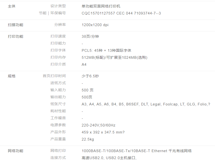 主要功能: 打印 打印速度: 38页/分钟 原稿尺寸: A3 首页时间: 少于6.5秒